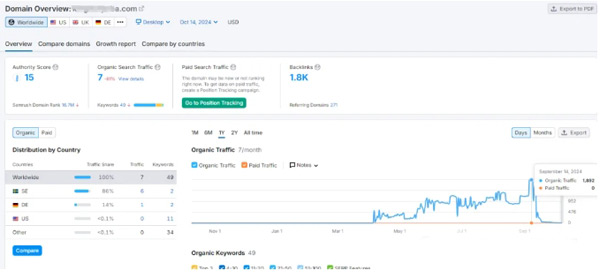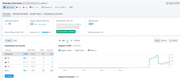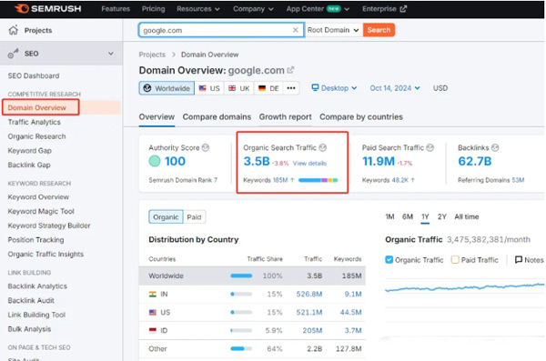 我們最常用的工具是Semrush,其中有一個(gè)數(shù)據(jù)是Organic search traffic,這個(gè)數(shù)據(jù)是這個(gè)網(wǎng)站谷歌月自然搜索流量的預(yù)估數(shù)值。